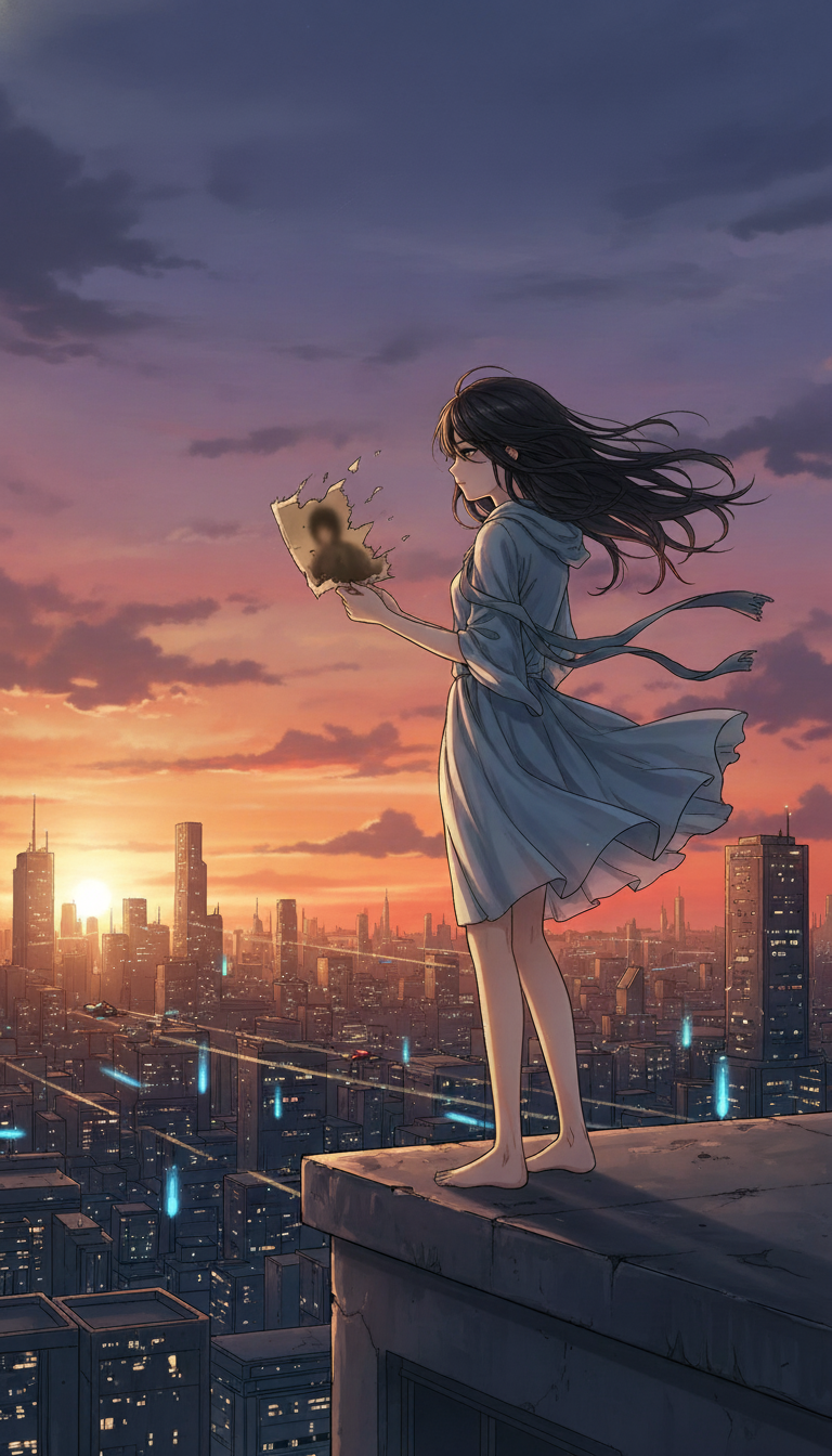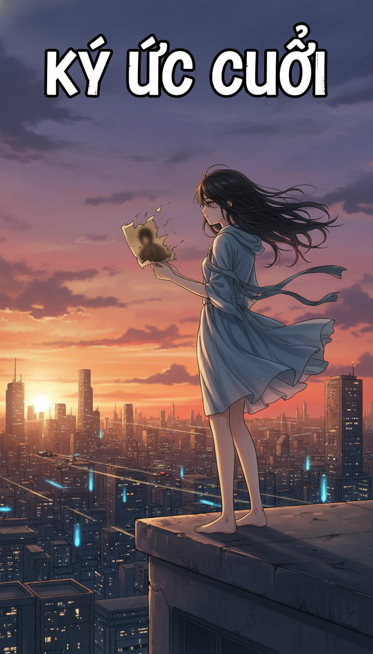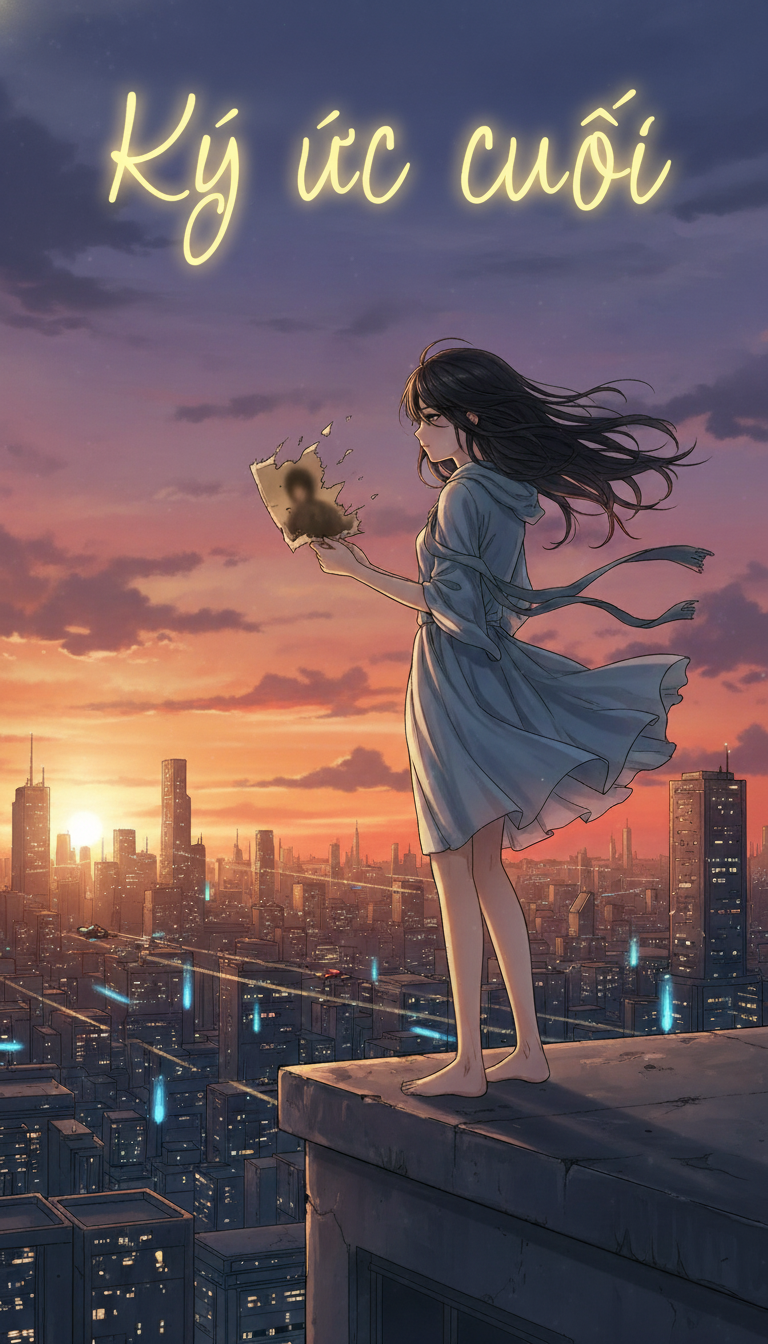Comic book cover illustration titled "Ký Ức Cuối". A girl stands alone on a rooftop at sunset, wind blowing through her hair, holding an old fading photograph. The city skyline glows under the orange and purple sky. Soft lighting, emotional atmosphere, cinematic composition. Semi-realistic manga style, A4 vertical (3:4 ratio).
